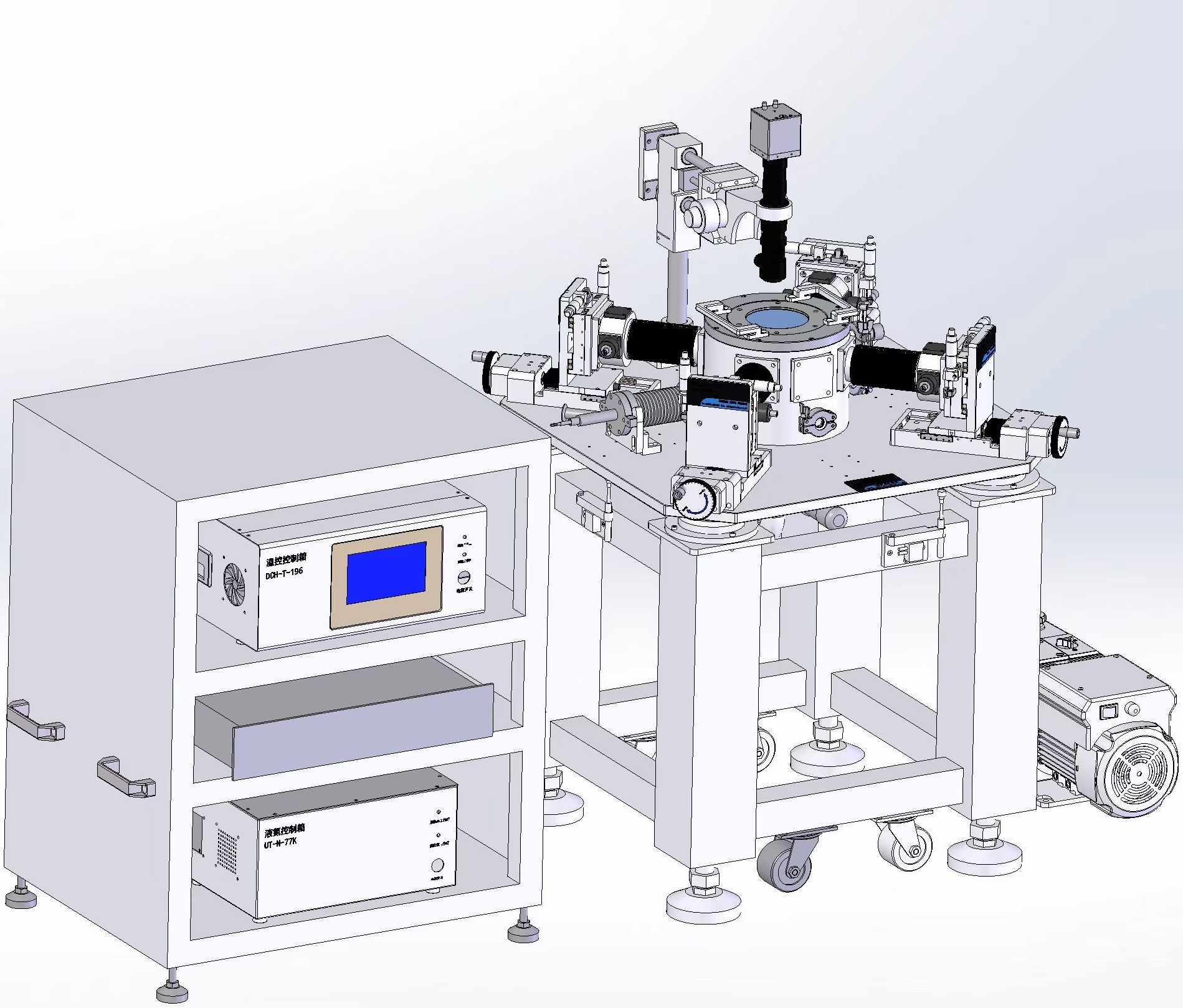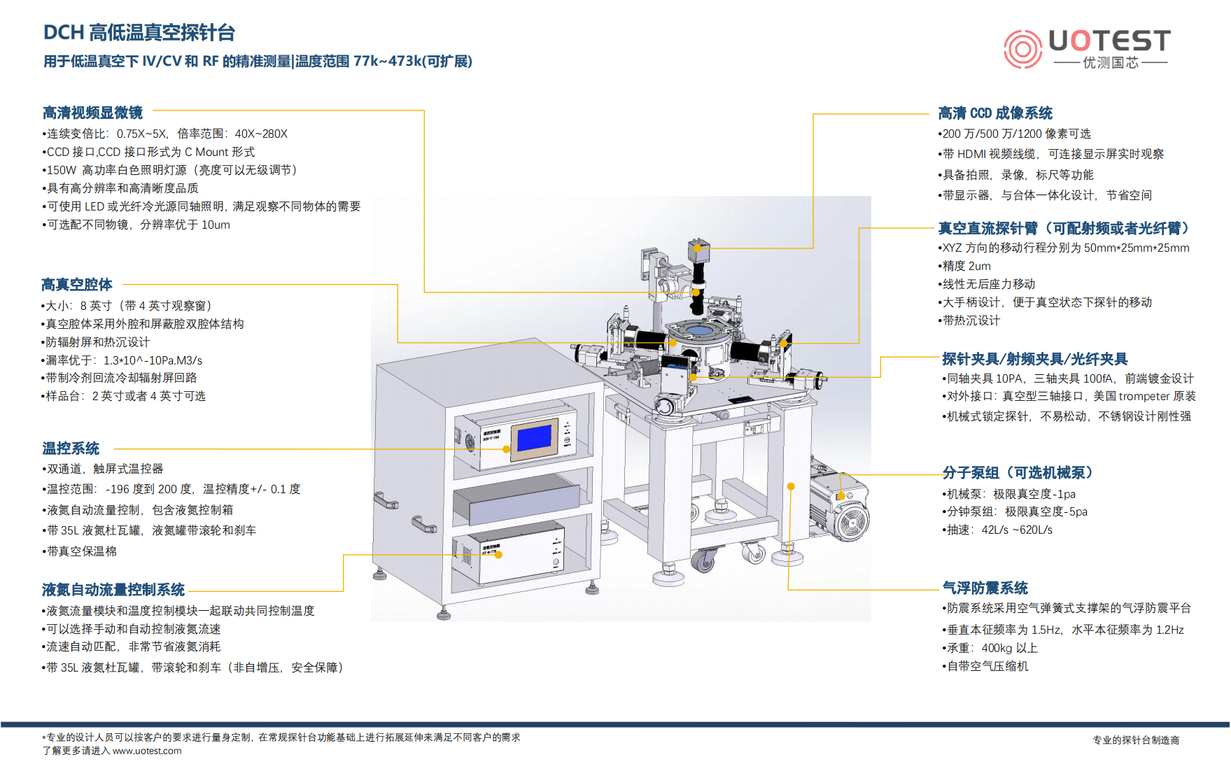 DCH系列高低溫真空探針臺(tái)是我司自主研發(fā)的一款在極端環(huán)境下給樣品加載電學(xué)信號(hào)的設(shè)備。可以實(shí)現(xiàn)器件及材料表征的IV/CV特性測(cè)試,射頻測(cè)試,光電測(cè)試等。通過(guò)液氮或者壓縮機(jī)制冷,可以在防輻射屏內(nèi)營(yíng)造一個(gè)穩(wěn)定的測(cè)試環(huán)境。在特殊材料,半導(dǎo)體器件等研究方向具有廣泛運(yùn)用。