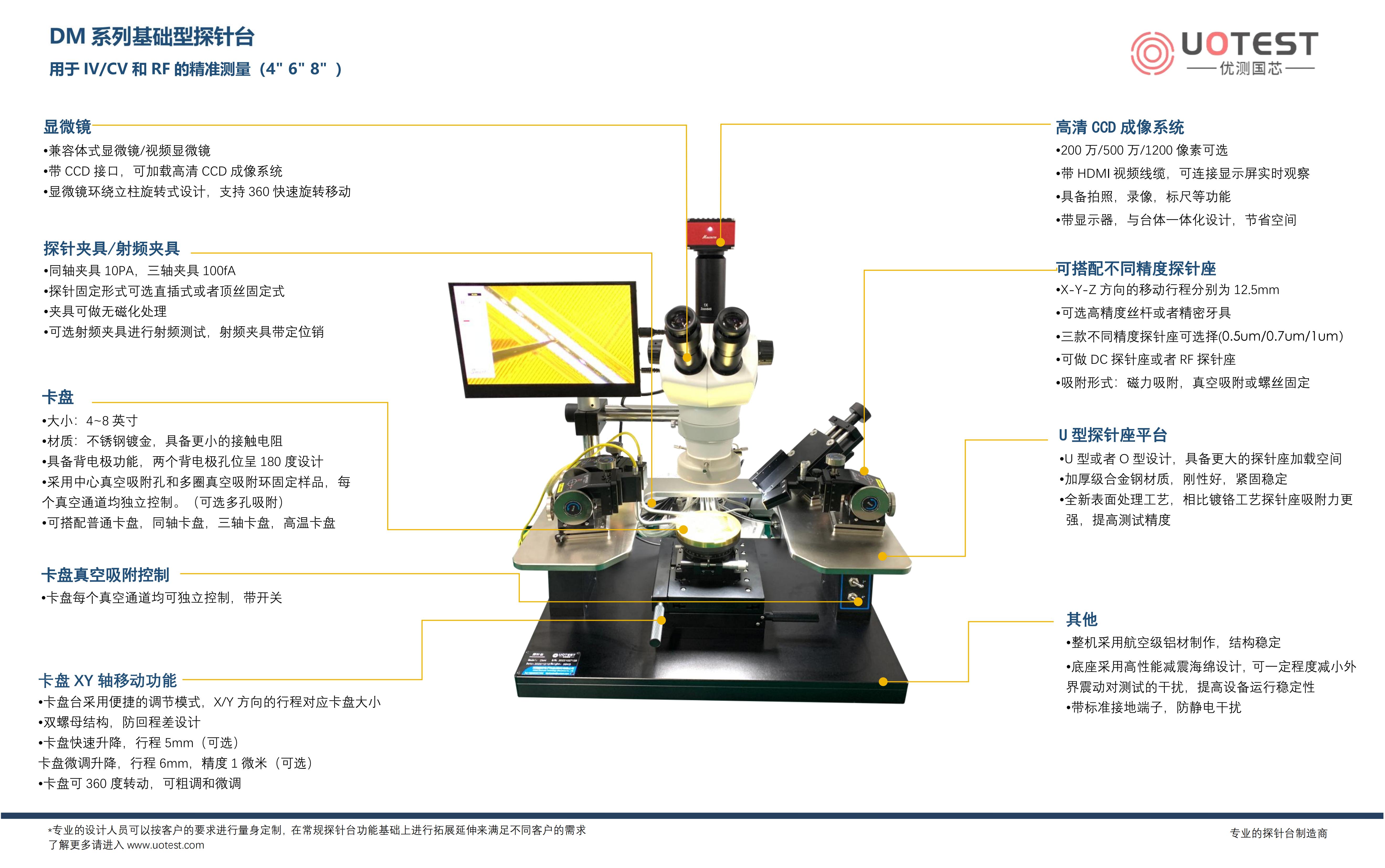 DM系列探針臺是我司一款基于高校教育與實驗室而研發(fā)的基礎型晶圓測試探針臺。其結(jié)構(gòu)緊湊,設計精密,價格實惠,配置靈活,極具性價比。在高等院校教學和小型實驗室科研過程中得到了廣泛運用,配合對應的儀器儀表,用于測試各類器件的IV、CV、I-t、V-t,光電信號,1/f噪聲測試,器件表征測試,RF射頻等。如果您的測試器件pad電極大于50um,此系列探針臺是首選。